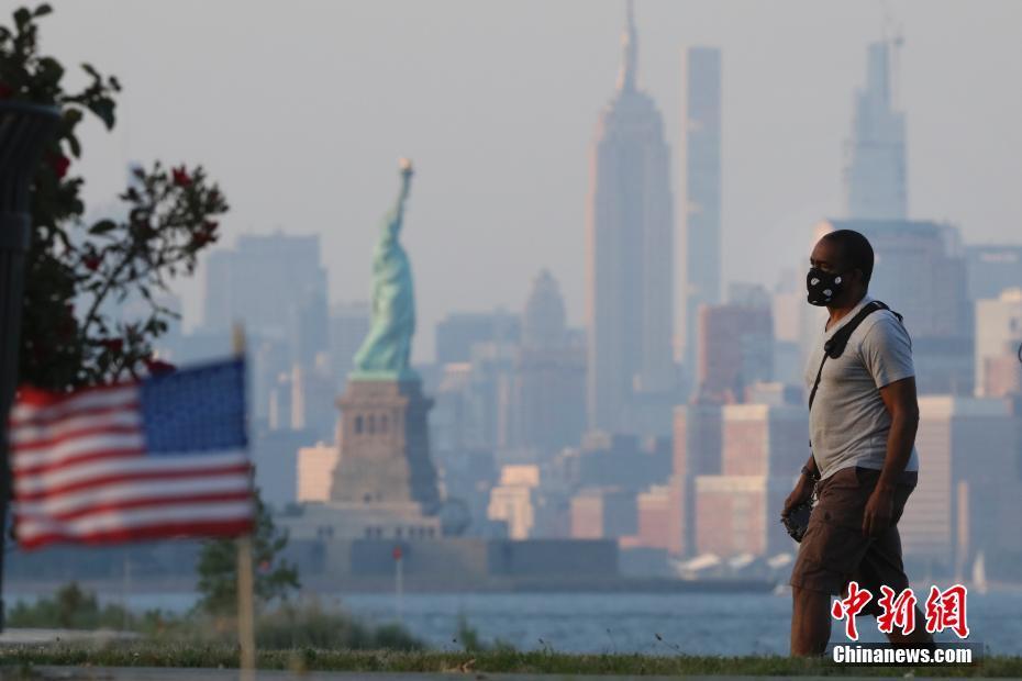 当地时间7月4日,一位居民戴着口罩从纽约曼哈顿对岸的海滨走过。当日是美国独立日,美国多地疫情仍面临严峻形势。