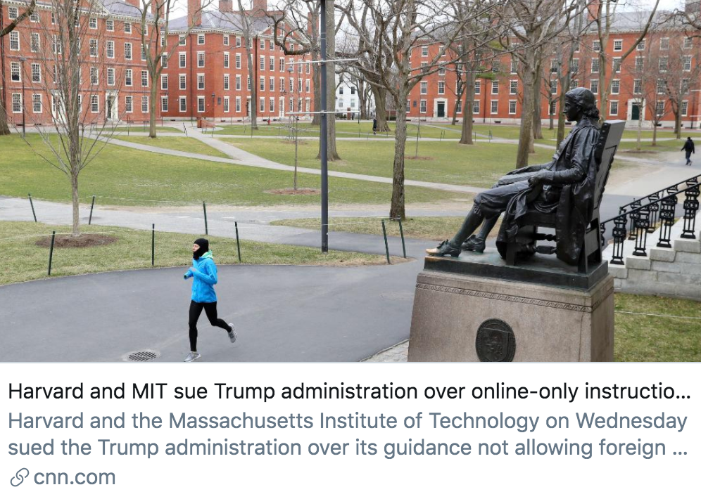 当地时间7月8日,特朗普表示,“如果学校不在今年秋季开学,就有可能切断对这所学校的资金支持”。同天,哈佛大学和麻省理工学院就留学生签证的新规定起诉特朗普政府。