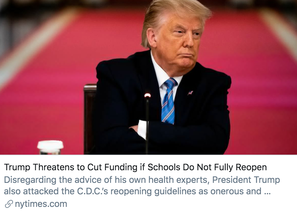 除此之外,特朗普还威胁称,“如果学校不在今年秋季开学,联邦政府就可能切断对学校的资金支持”。