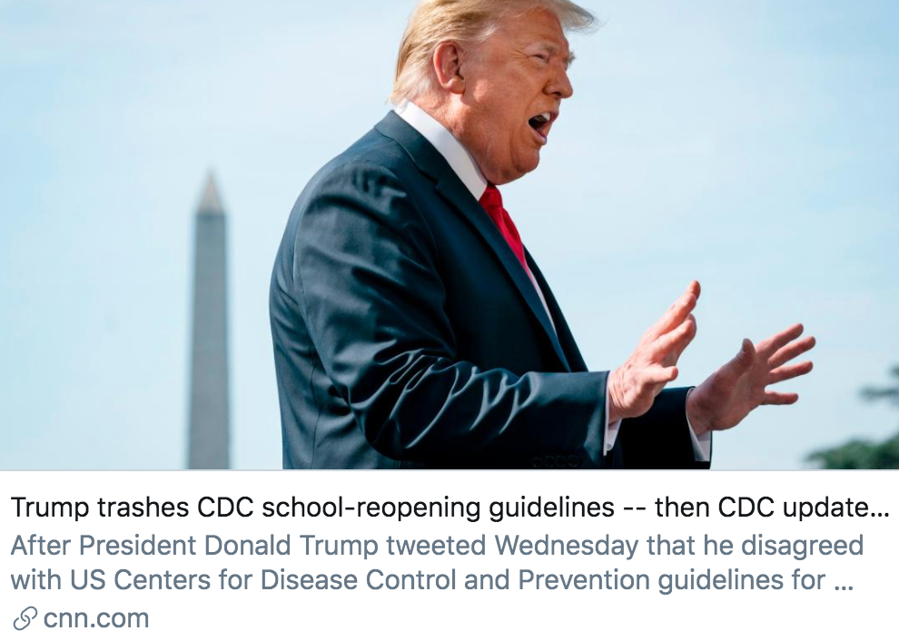 但特朗普表示,CDC提出的指导方针“非常严格且代价昂贵”,它要求学校做一些不切实际的事情。特朗普还称,将与疾控中心就此事进行讨论。