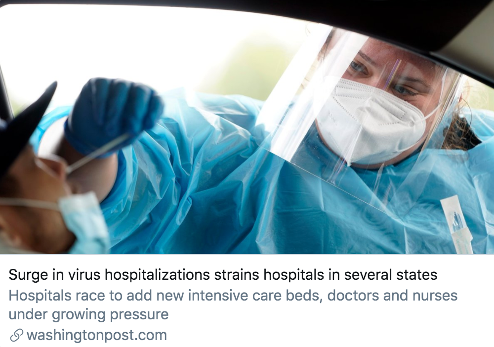 据《华盛顿邮报》报道,美国确诊病例已超300万例,多州确诊病例数量激增,医院正在承受着巨大的压力。其中,佛罗里达、亚利桑那州、加利福尼亚州及得克萨斯州的医院即将接近饱和,医护人员的个人防护设备严重不足。