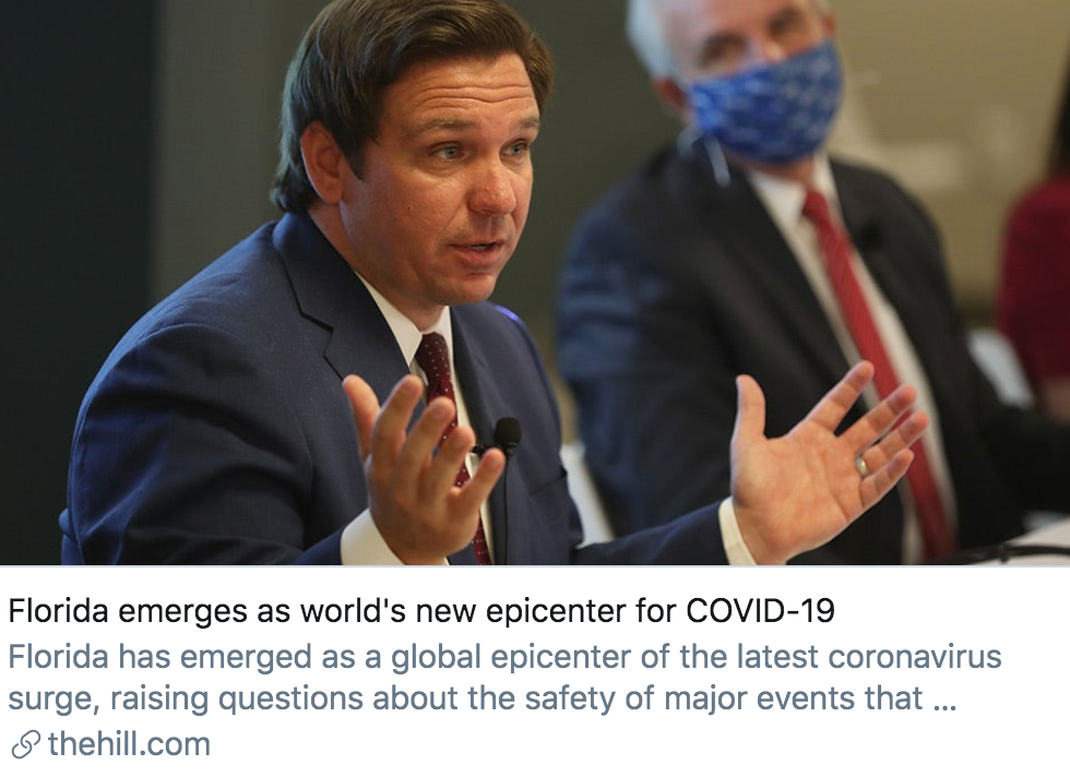 但是,佛罗里达州州长德桑蒂斯一直在试图淡化疫情的严重性。当地时间7月6日,德桑蒂斯表示,“不必担心,新增病例都是健康状况良好的年轻人”。