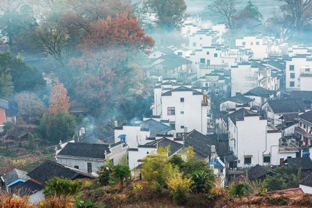山雾间隐约可见的民居,和炊烟袅袅,仿佛是一副天然水墨画。