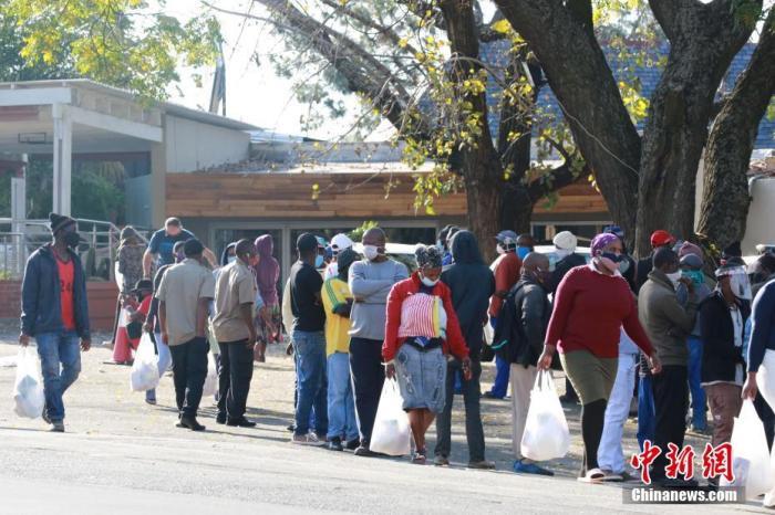 资料图:图为在南非约翰内斯堡一社会救济站,领取救济食品的民众排成长龙。 中新社记者 王曦 摄