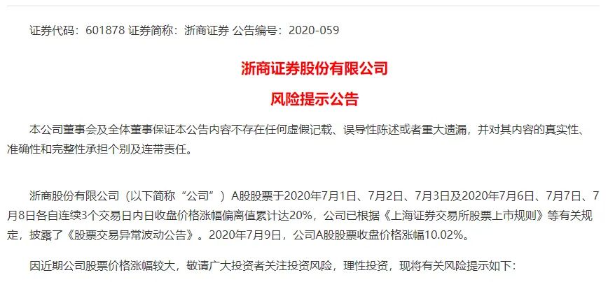 作为A股本轮券商股龙头,浙商证券连续7个涨停板。今日晚间公告提示投资风险,称公司市净率和市盈率明显高于同行。浙商证券表示,因近期公司股票价格涨幅较大,敬请广大投资者关注投资风险,理性投资。