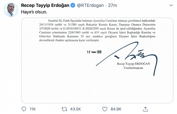 当天早些时候,土耳其最高行政法院作出裁决,废除了1934年通过的将圣索菲亚大教堂变为博物馆的内阁法令,该裁决为圣索菲亚博物馆改为清真寺扫清了障碍。