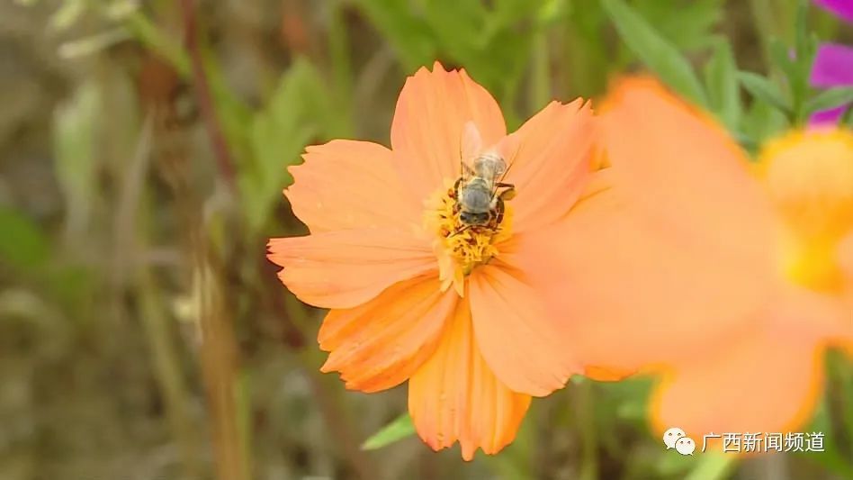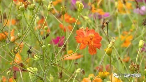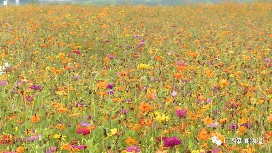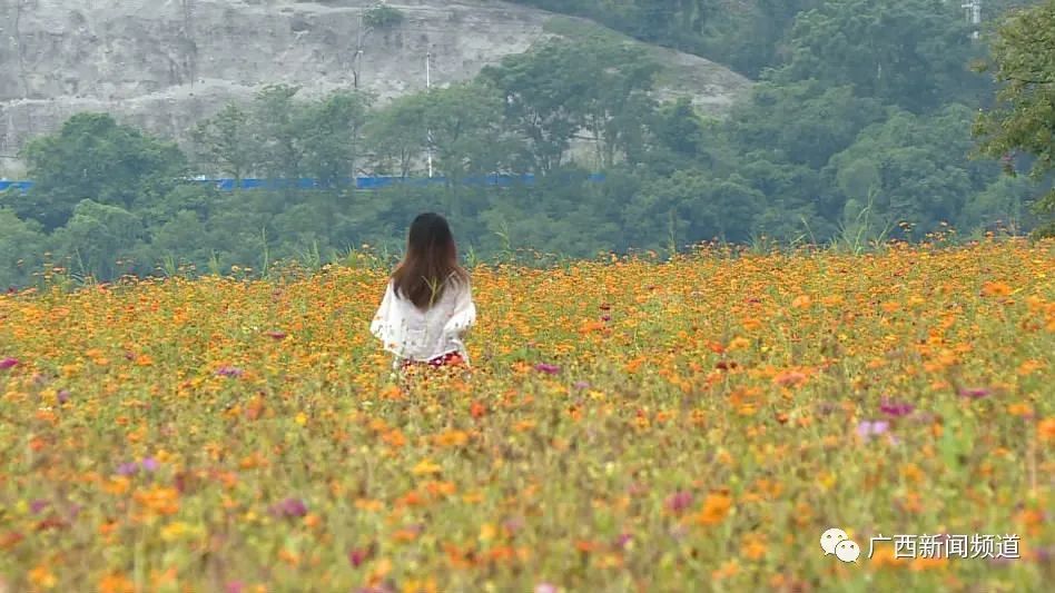 驱车来到南宁市邕宁区江湾路,您会发现这里藏着一片百亩花田,它背靠郁郁葱葱的森系小山坡,面朝一湾江水,在蓝天白云的映衬下宛如一幅田园画。