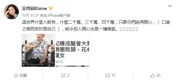 7月26日吴绮莉公开发文:这个世界什么人都有,什么2000万 3000万,4000万,只是你们说得开心(口德这东西受的是自己),能令别人开心也是一种福气。