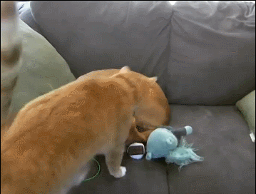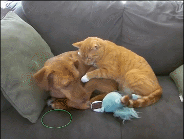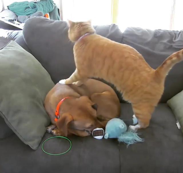 这天主人一家全部外出,Joule离开主人又变得没有安全感缩成一团,然而天使一样的Kevin竟然跳到沙发上安慰它。Kevin先是直接踩到Joule的背上引起它的注意,后面主动用身体磨蹭它,像是撒娇又像在安慰Joule:你别怕,有我陪你!
