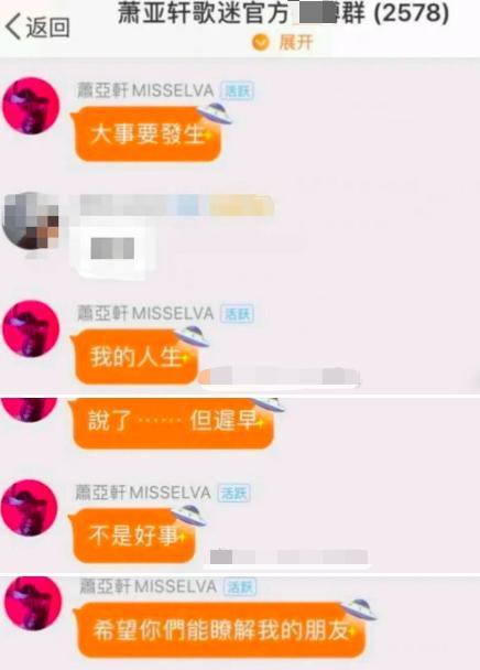 萧亚轩连发好几条消息,内容是"大事要发生,我的人生,说了但迟早,不是好事,希望你们能理解我的朋友"。