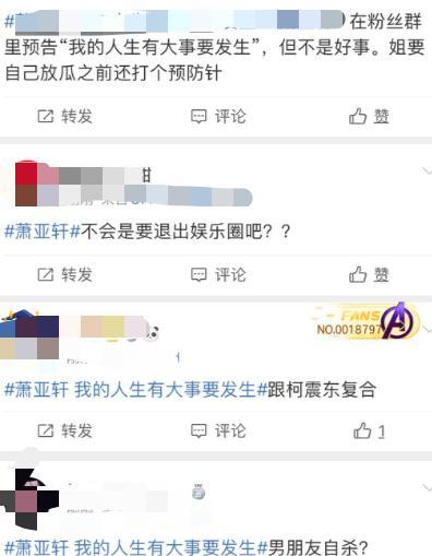 还有人说是萧亚轩知名朋友疑似要爆料,不过也貌似不太像大事。更有人直接猜测可能是分手,和小男友感情不稳定。