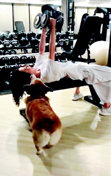 健身房的设备虽然不及洗米嫂那样的豪华,但亦是不少。从其晒出的照片可以看出,光哑铃就排了好几排,健身的时候还被家中的宠物狗骚扰。