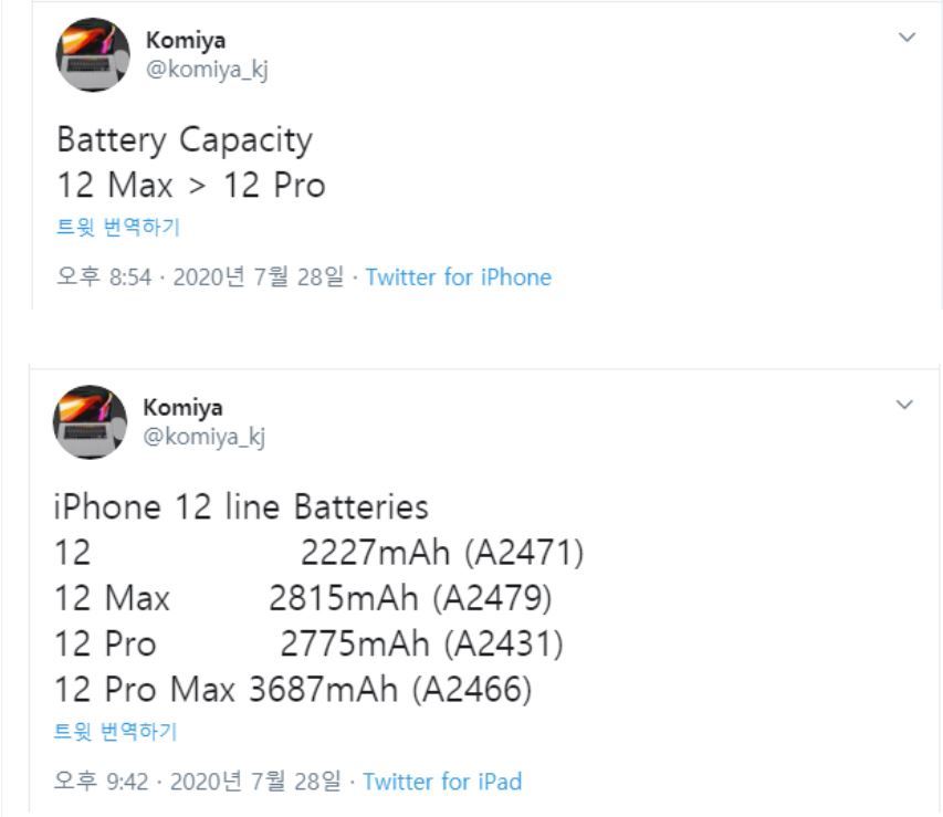 随着四种型号的苹果电池陆续获得认证,iPhone 12系列四款新机的电池容量似乎已经尘埃落定。但在各款机型的具体容量大小方面,现在则出现了一些变化。根据爆料博主@Komiya_kj最新给出的消息称,虽然都配有6.1英寸显示屏,但iPhone12Max的电池容量会比iPhone 12 Pro更大一些,而造成这样的状况则是因为iPhone 12 Pro拥有更大的相机模组所致。