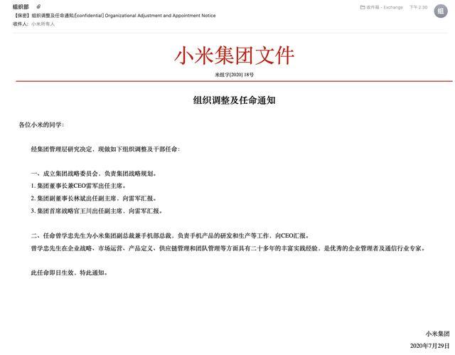 7月29日,小米集团公布了最新高管任命:任命曾学忠出任小米集团副总裁、手机部总裁,负责手机产品的研发和生产工作,向集团董事长兼CEO雷军汇报。