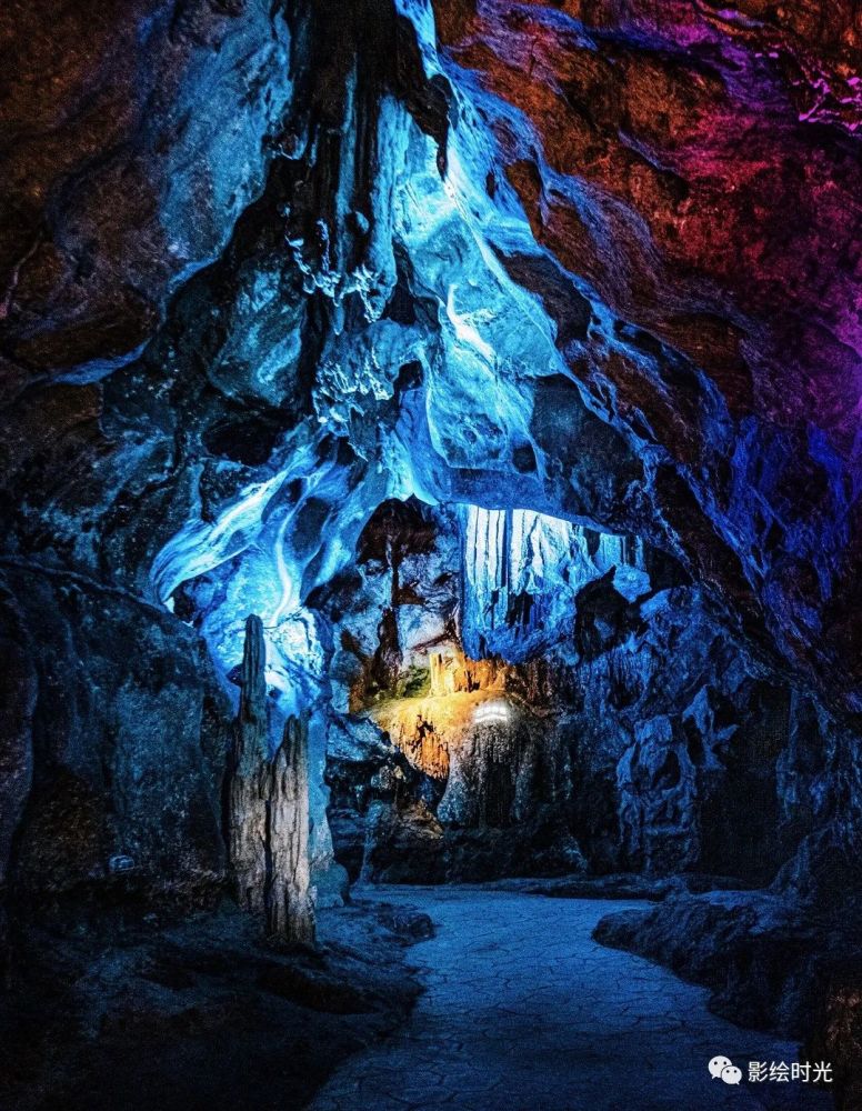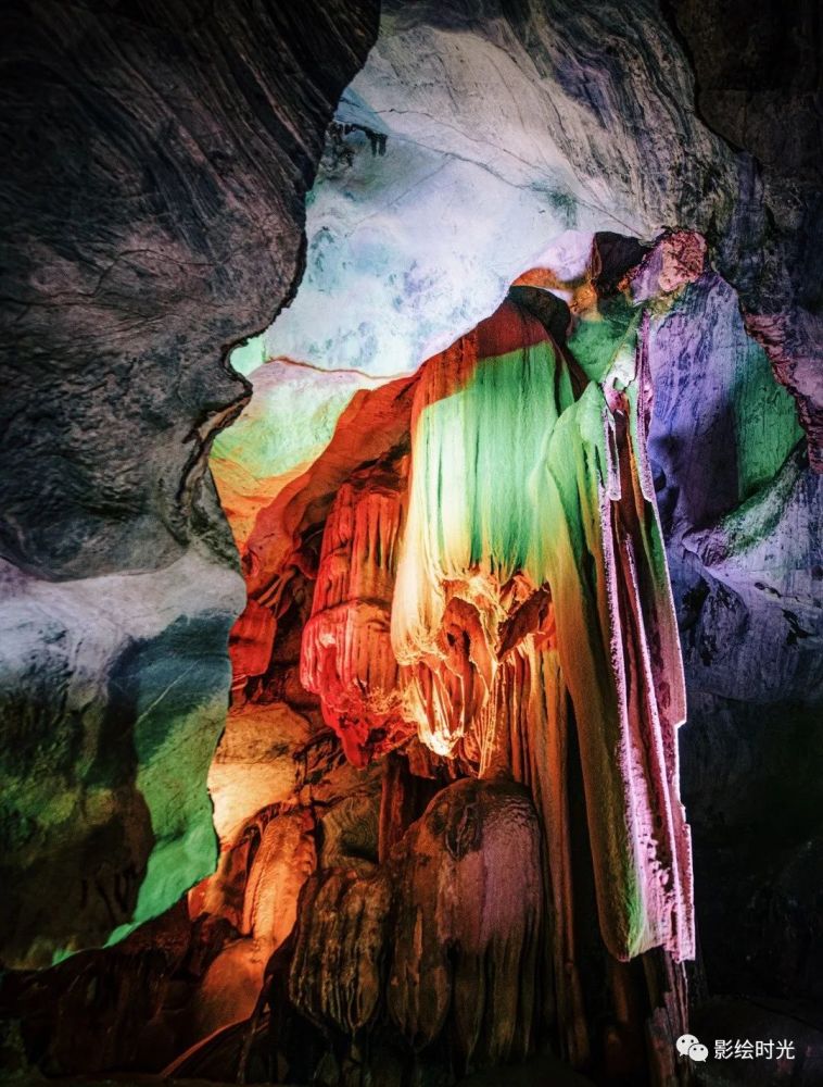 蟠龙洞在离蟠龙天湖不远的地方,是一处喀斯特岩溶历经亿万年逐渐形成的景观。因着行程安排,探秘蟠龙洞也是我第一次夜晚进溶洞玩耍,虽然洞里的光线二十四小时都差不多,但从黑夜中走进这个色彩斑斓的世界,还是多了更多心理上的新鲜体验。