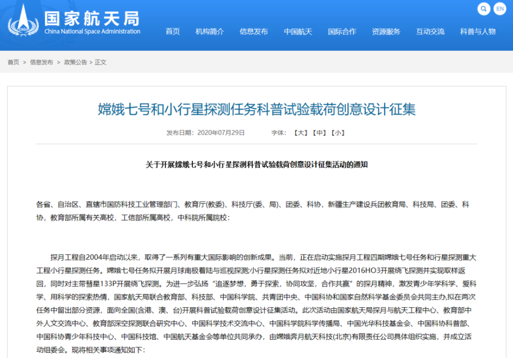 ●近日,国家航天局、教育部、科技部、中国科学院、共青团中央、中国科协、国家自然科学基金委员会联合下发《关于开展嫦娥七号和小行星探测科普试验载荷创意设计征集活动的通知》。《通知》介绍,嫦娥七号任务拟开展月球南极着陆与巡视探测;小行星探测任务拟对近地小行星2016HO3开展绕飞探测并实现取样返回,同时对主带彗星133P开展绕飞探测。(来源:国家航天局官方网站)