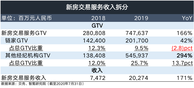 2019年,贝壳新房交易GTV同比增长166.2%至7476亿元,其中,链家品牌贡献的GTV是2017亿元,涨幅为41.6%。换句话说,贝壳平台上非链家品牌贡献了大多数的GTV,从2018年1384亿元增至2019年的5459亿元,涨幅达到294%。与之相对的是,2019年,平台新房交易经纪门店数量跃升至3.8万家,新房交易数量增多至53.3万笔。