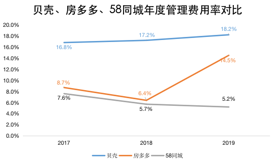 贝壳的三费当中,包括参与企业员工工资、办公室费用、招聘及培训等在内的一般管理费用是它最大的支出项。与去年上市的房多多、“老对手”58同城相比,虽然同处于房地产经纪行业的大盘子里,贝壳的管理费用率却是最高,且还在持续增长。