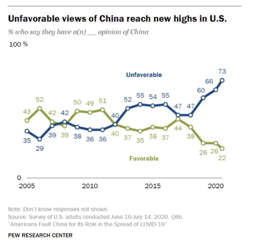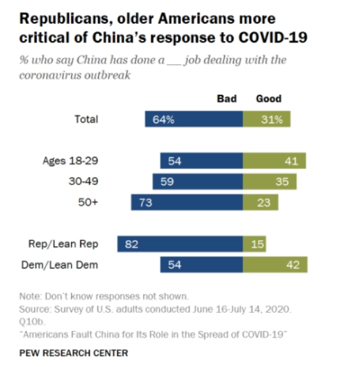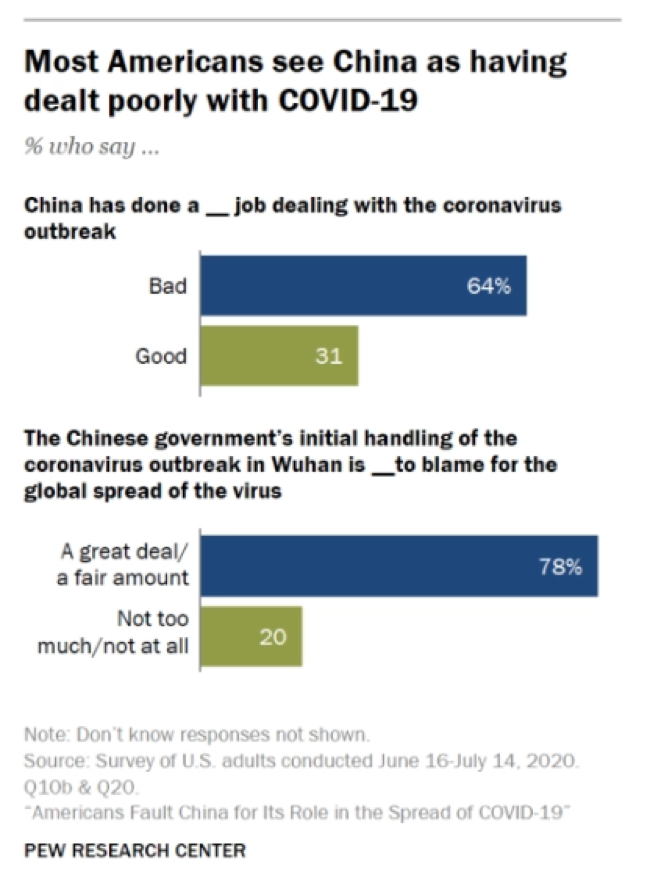 皮尤还指出,仅自今年3月美国新冠疫情彻底暴发以来,美国人对中国的负面看法就增加了7%,并称这主要是因为美国民间普遍认为是中国早期防疫不力才导致美国疫情失控。