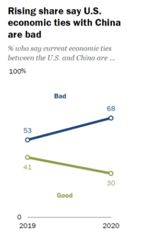而除了疫情方面对中国持负面看法,美国受访者对中美贸易关系以及中国的“人权”也都持负面看法。其中,68%的受访者认为两国经贸关系情况不佳,比2019年5月时的这一民调结果增加了15%;有73%的受访者认为美国应该去插手中国的“人权”事务,哪怕这会损害两国的经济关系。仅23%的人认为美国应该优先加强与中国的经贸关系。