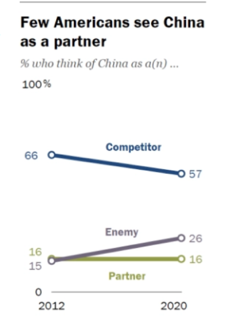 另外,有26%的受访者认为中国是美国的“敌人”。皮尤称这一数字比2012年时增加了近乎一倍。有57%的受访者认为中国是美国的竞争对手,只有16%的受访者认为两国是伙伴关系。