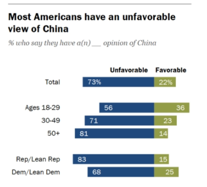 如下图所示,这项由美国民调机构皮尤在今年6月16日-7月14日之间对1003名美国成年人进行的调查显示,他们中对中国持负面观点的人已经超过了7成,高达73%,比2018年同期增加了26%。仅22%的受访者对中国持正面看法。