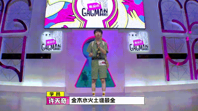 许天奇的“一发技”是“金木水火土”谐音梗:金木水火土,谁最金——土,因为土豪多金;谁最火——水,因为水站C位;谁最水——木,因为木头遇到水,他摆起双臂模拟漂浮状态,“我浮了我浮了”。对一部分人来说,许天奇的幽默是一种自成体系的自说自话,出其不意又自带逻辑;但另一部分人只会觉得生硬尴尬,莫名其妙。