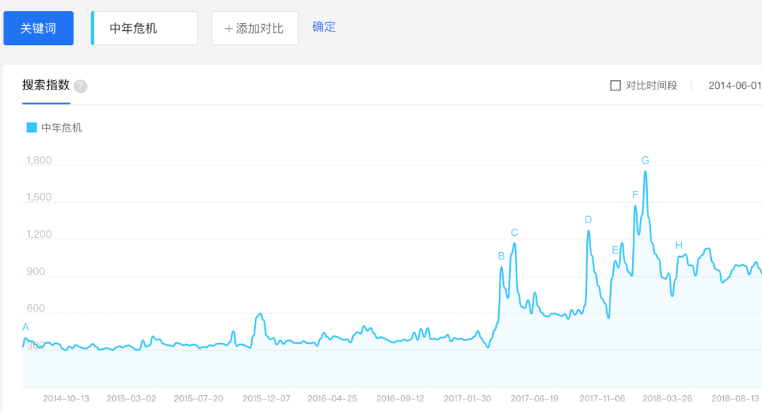 关键词 「中年危机」,本身的讨论量级从2012年开始都不高,然后,到了2017年过完年,这个关键词的热度很快翻倍,接着在2017年年底和2018年初达到巅峰。等这个话题恢复平缓的时候,你会发现热度已经比2016年翻了一番。