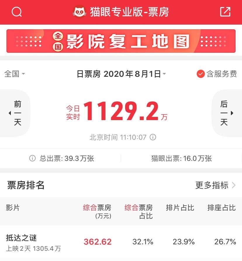 李现主演的《抵达之谜》成了影院复工之后流量明星主演的作品,该片目前排片率最高,估计两个原因导致票房不高,一个就是影院复工还不是很全面,只是部分安全区的影院复工,而且每个影院安排的上座率不超过30%,还有一点本身电影品质也不是很高,只是李现主演而已。所以这两个原因导致电影没能激发更多观众到影院观看。