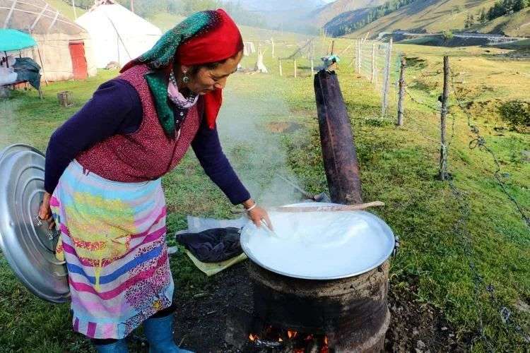 牧民正在熬制奶疙瘩。对于牧区人民来说,各式各样的奶制品是他们日常饮食中非常重要的一部分。