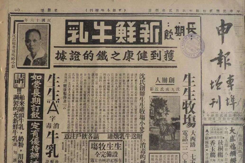1935 年 9 月 28 日,申报本阜增刊头版刊登了生生牧场新鲜牛奶广告。