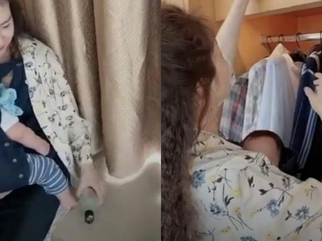 不过生了二胎后,刘荷娜的家庭主妇生活还是有些不容易。在一段视频中,刘荷娜胸口挂娃做家务,她先是有些艰难地弯腰用毛巾擦了窗台上的灰尘,又来到衣帽间整理摆放着众多衣物的衣柜。