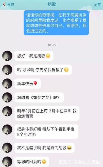 粉丝有七千多万的胡歌,在每天数都数不过来的私信中,看到了这个女孩儿,并回复说“新年快乐,您想看《如梦之梦》吗?我给您留票,要看八个小时呢,可一定要养好身体。”最后还加了一句:“我不是骗子,我是真的胡歌。”