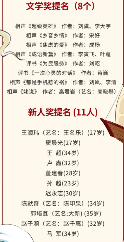 看到这份名单,估计大家也都看到了一些眉目。基本上能够出现名字的都是现在露面的一些年轻的相声艺人。这其中就包括高晓攀、卢鑫、陈印泉、李寅飞、窦晨光、董建春等人,这些人常年活跃在各个综艺节目、晚会上面博得一个关注度。除了这些人之外的一些相声演员,例如宋好等人都是曲协的会员,能够拿到奖也不意外。除了参演人员之外,再来看一下这些作品,你也能够看出一二。例如《家好月圆》、《好人好抱》、《乡音乡情》、《为民服务》、《姥说》(2017年还登陆过央视的春晚)等等这些作品从名字上就看得出来这个故事在说什么,演员要表达的主旨是什么。这所有的一切都非常的符合曲协的主导思想。