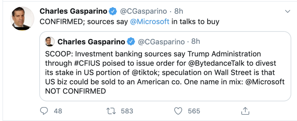 福克斯商业记者查尔斯·加斯帕里诺7月31日发推表示,有消息证实,微软已就此事进入谈判阶段。而加斯帕里诺推特中提到的“CFIUS(The Committee on Foreign Investment in the United States)”,正是美国政府为审核外国投资设立的委员会。该委员会隶属美国财政部,1975年在时任总统福特颁发行政命令后成立。