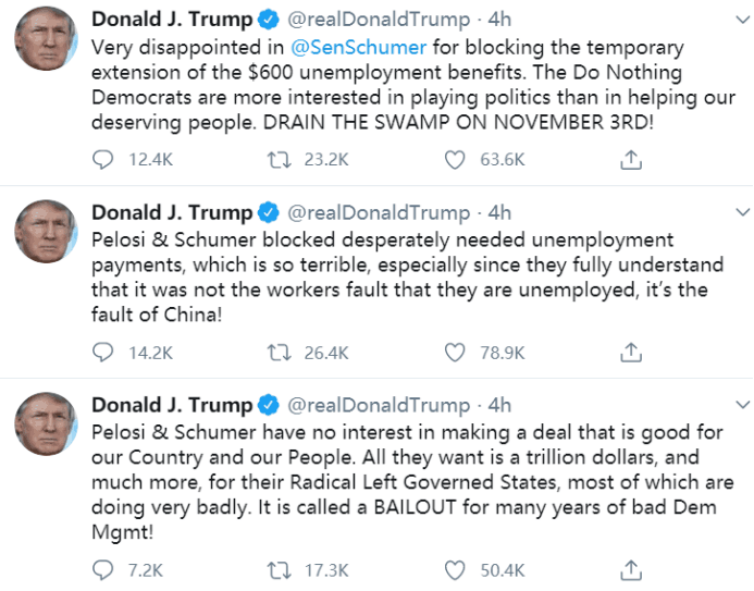 “佩洛西和舒默阻拦了迫切需要的失业救助金计划,这太糟糕了,尤其是他们完全明白失业不是工人们的错,而是中国的错!”
