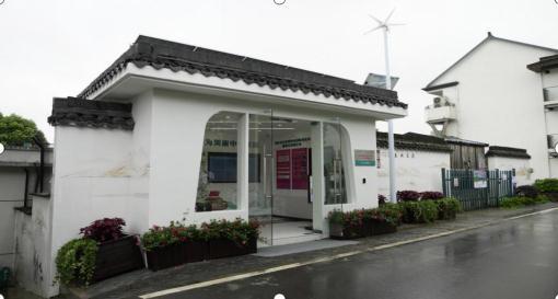 这处驿站位于浙江省杭州市富阳区东梓关村,是由一处废弃的配电房改造而成的。驿站屋顶配备了光伏发电板,它与旁边的几台风力发电机一起,担负起驿站日常运转所需的电能。