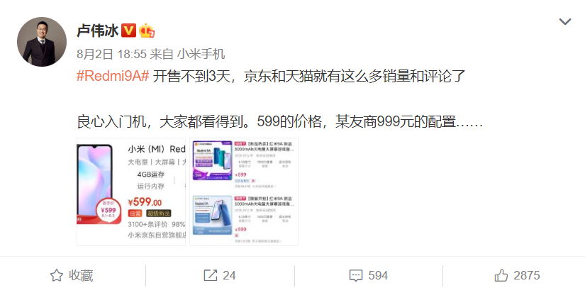 对于这款机器,小米高管卢伟冰表示,该机虽然是一款599元的智能手机,但是配置达到了友商999元的水平;作为对比,华为旗下热销的畅享10e目前的售价为999元,可以买到4GB+64GB存储版本,这两款机器的配置相差并不是很大,但是差价却达到了四百元。