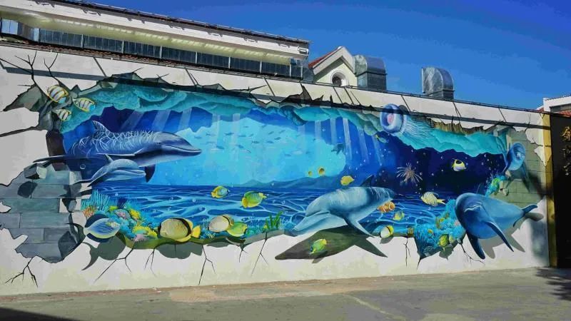3D式的立体墙绘上,一个个海洋生物栩栩如生,仿佛稍一跃动就可回归大海。