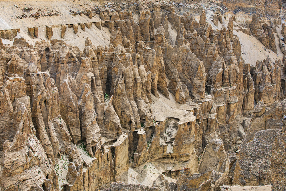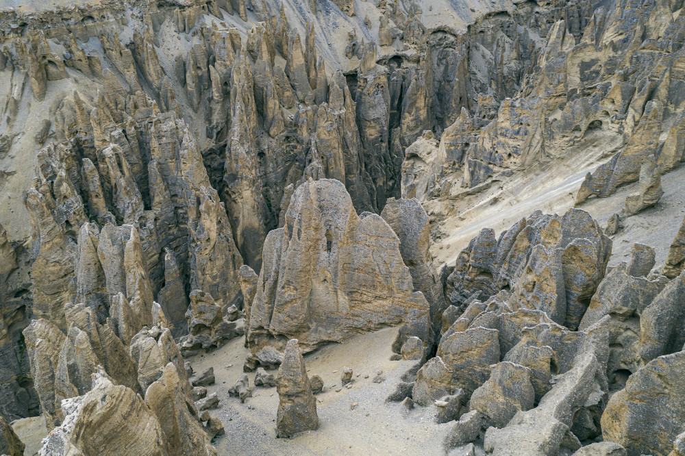 它被喜马拉雅北麓的定结湿地紧紧的包裹着,成了一处秘而不宣的神秘之地。峡谷里耸立的土柱才是这里真正的传奇,它们错落纠结的生长在谷底,或站队昂首,或严峻独立,或成排成列,一种蔑视天地的气势令人生畏。