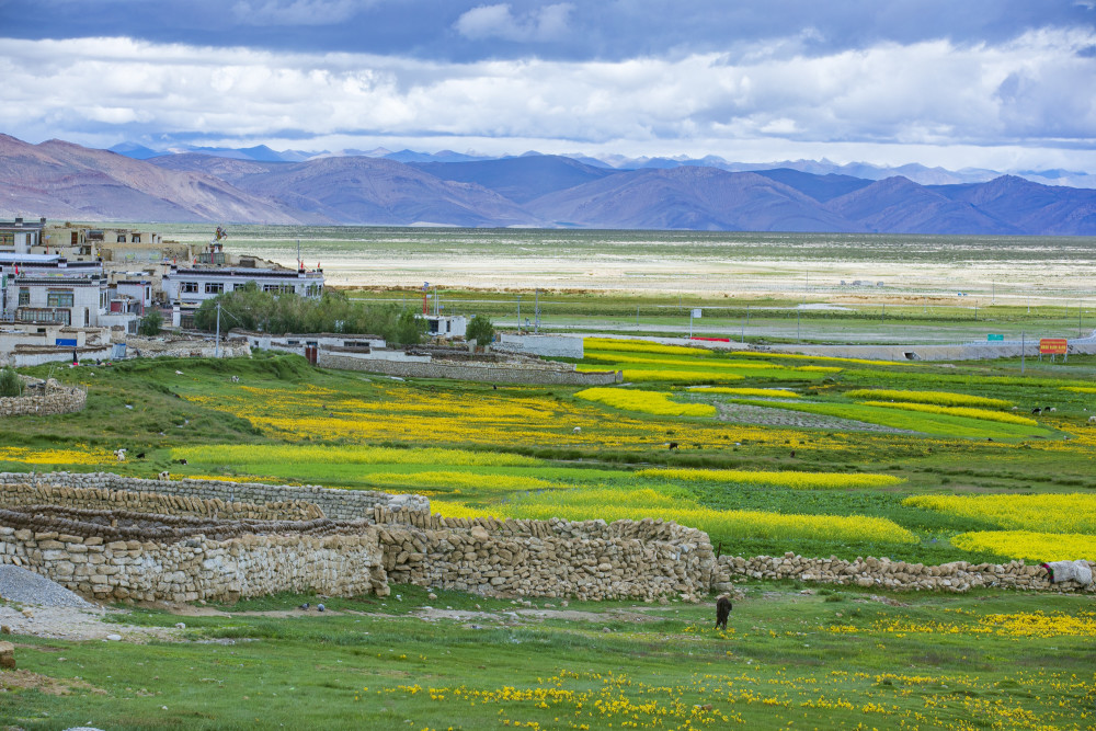 当峡谷在定结湿地蔓延消失后,雪山融水顺着谷底流下来,形成了一片冲积扇湿地,也造就了一处在贫瘠的高原上绝佳的生存之地。此时一座典型的藏式村庄出现了,这就是姆村,它被油菜花包围着,与蓝天、白云、雪山构成了一幅唯美的油画。