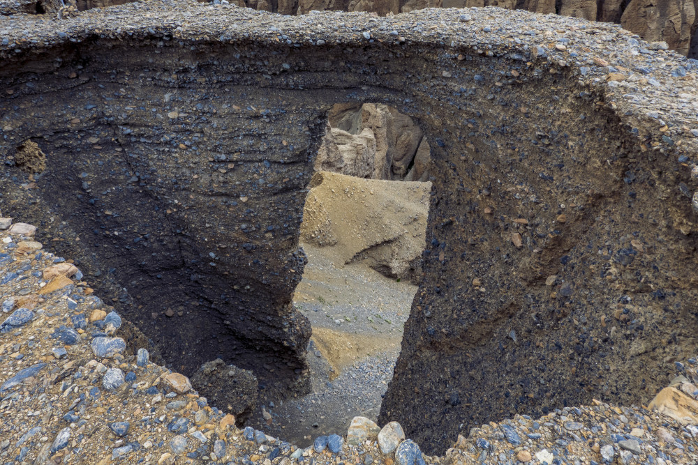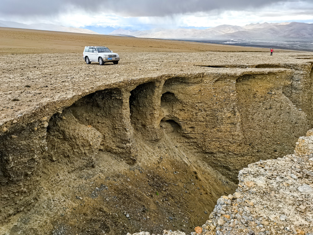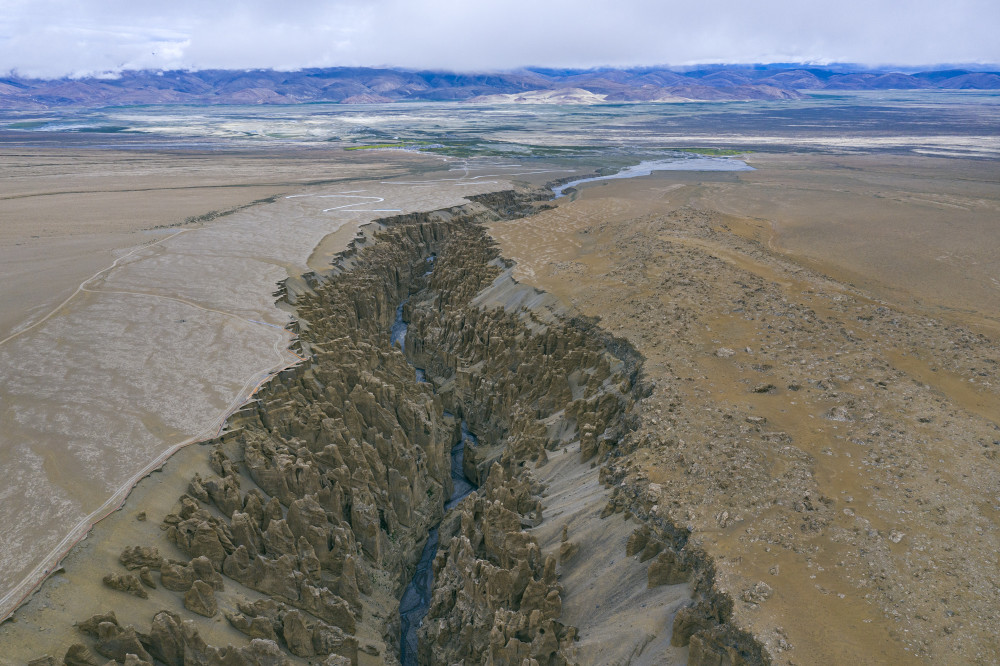 峡谷底部每年的七八月份都会流淌着一条河,那是喜马拉雅山融化的雪水。我们想深入谷底一探究竟,奈何谷深无路,只能作罢。从航拍镜头里看到,这条峡谷从喜马拉雅北麓,一路向北延展,由深及浅,最终如草蛇灰线,在定结湿地草原上消失的无影无踪。