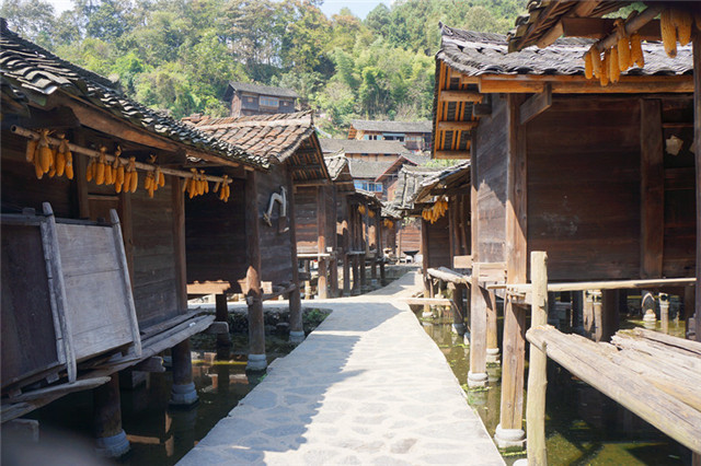 新桥村是一个历史悠久的苗家寨子,村里百分之九十五的村民都是苗族,小村三面环山、地势低洼,村前有一条小河缓缓流过,在村子中央形成了五个水塘,村民们就在这水塘上修建了44座水上粮仓来储存粮食,据说这些水上粮仓的历史已经超过百年了。我们知道,粮食最怕的就是潮湿,那把粮仓置于水塘之上,不就是“火上浇油”了吗?