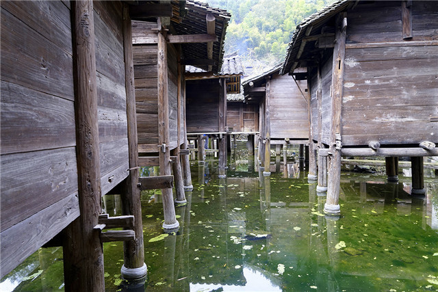 但是新桥村人在建粮仓时早就考虑到了,他们在水塘里立上一个个露出水面的石墩,然后在石墩上按照苗寨建造吊脚楼的方式,在每个粮仓下面立上6根圆木柱,圆木柱与水面保持1.5米的高度。这种高度的造型再加上良好的通风空间,保证了水塘中蒸发的水气,很难进入粮仓中,给粮仓防潮提供了有利条件。