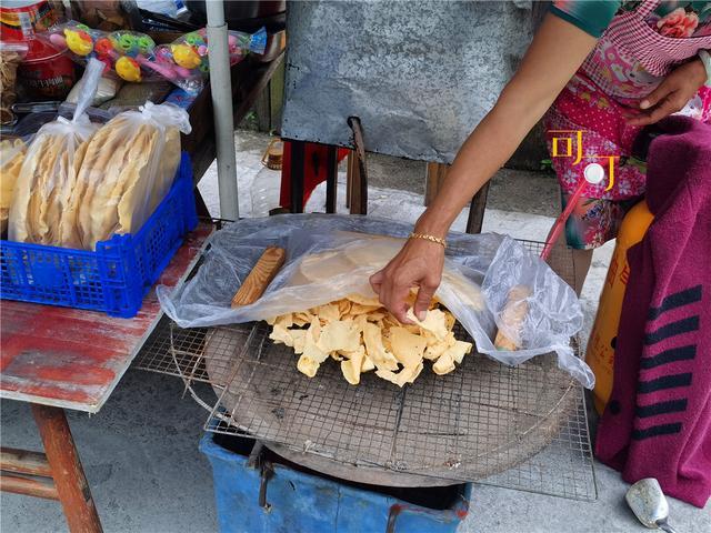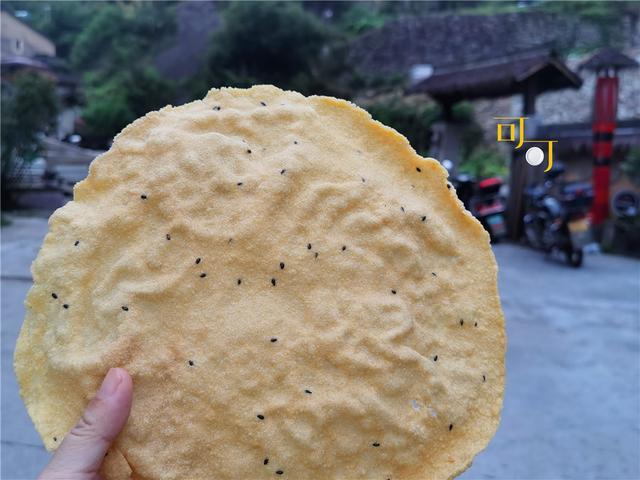 2元钱一大片玉米饼,类似薄脆,比我脸还大,咸的,油炸食品,非常酥脆,步行在这个村子里,凡是摆摊的地方都可以看到这种玉米饼。以前村子里的村民一日三餐“六谷糊”,也就是玉米糊糊,小孩子们能吃的零食估计也就是玉米饼了吧?