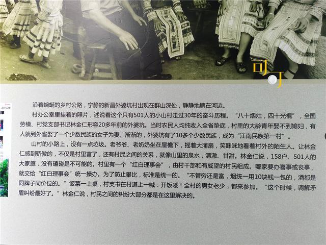 上面写着外婆村的历史:这个一百多户人家,501人的小山村,曾经“八十烟灶,四十光棍”,通过三十年奋斗,村干部形成一个“红白理事会”,统一操办,标准统一,不管穷还是富,家里办事烟统一用10元钱一包,酒都是同一牌子同一价位,饭菜上桌,村支书喊一声开饭了,全村的男女老少都来参加。有矛盾的村民,也大多在这时候调解好了。