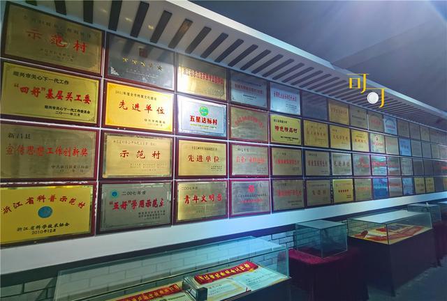 这是陈列室里挂着的外婆坑村这些年获得的荣誉,满满的一墙。陈列柜里还放着一些村民做的女红。