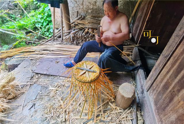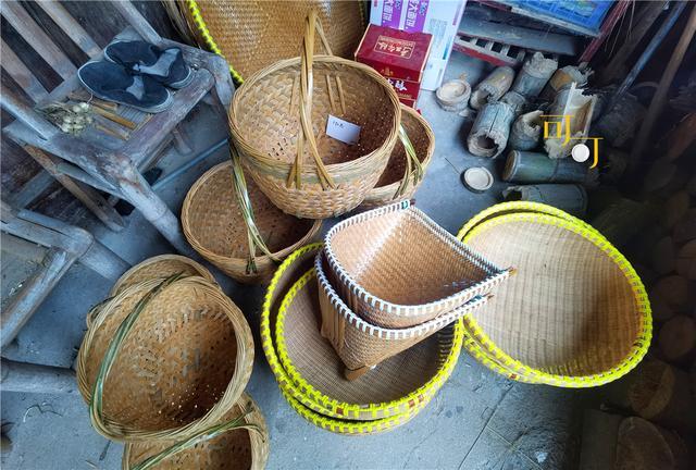从陈列馆出来,看到村民用刀削竹篾子在编竹篮。