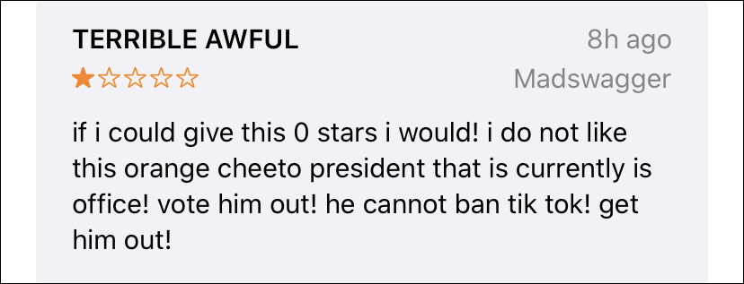 粉丝们纷纷响应布克的号召,几天内便有成千上万名TikTok美国用户涌入苹果应用商店,给特朗普竞选app刷一星差评。