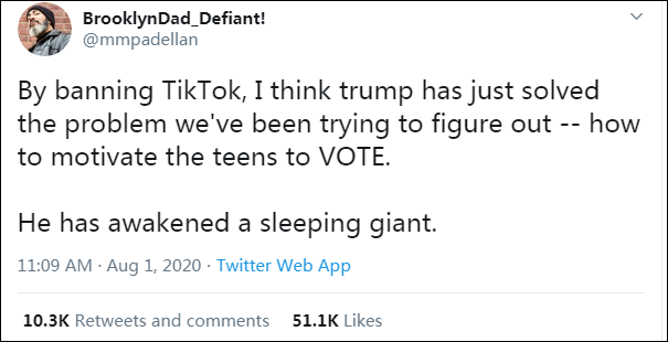 还人发推讽刺说,特朗普封禁TikTok的举动,解决了美国一直头疼的问题,即如何激励青少年投票。“他唤醒了深睡中的巨人”。该条推特截至目前已获得上万转发、5万多点赞。
